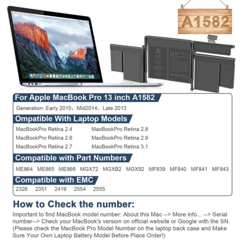 TIPS: Important to find MacBook model number: About this Mac --> More info... --> Serial number--> Check your MacBook's version on official website or Google with the SN. (Please check the MacBook Pro Model Number on the laptop back case and Make Sure Your Own Laptop Battery Model Before Place Order!)